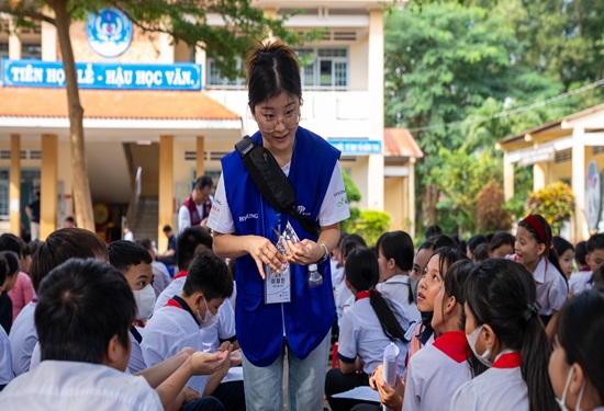 Các em học sinh chụp hình lưu niệm cùng với tình nguyện viên Hàn Quốc